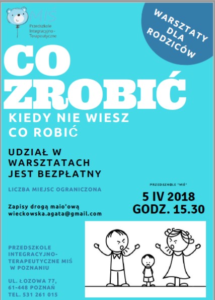 Z okazji Światowego Dnia Świadomości Autyzmu zapraszamy wszystkich rodziców z Poznania oraz okolic na bezpłatne warsztaty pn.: Co zrobić, kiedy nie wiesz, co robić? Warsztaty odbędą się 5 kwietnia 2018 r. o godzinie 15.30 w Przedszkolu Integracyjno-Terapeutycznym Miś w Poznaniu, przy ulicy Łozowej 77. Prowadzącą warsztaty jest Pani Agata Więckowska, psycholog.